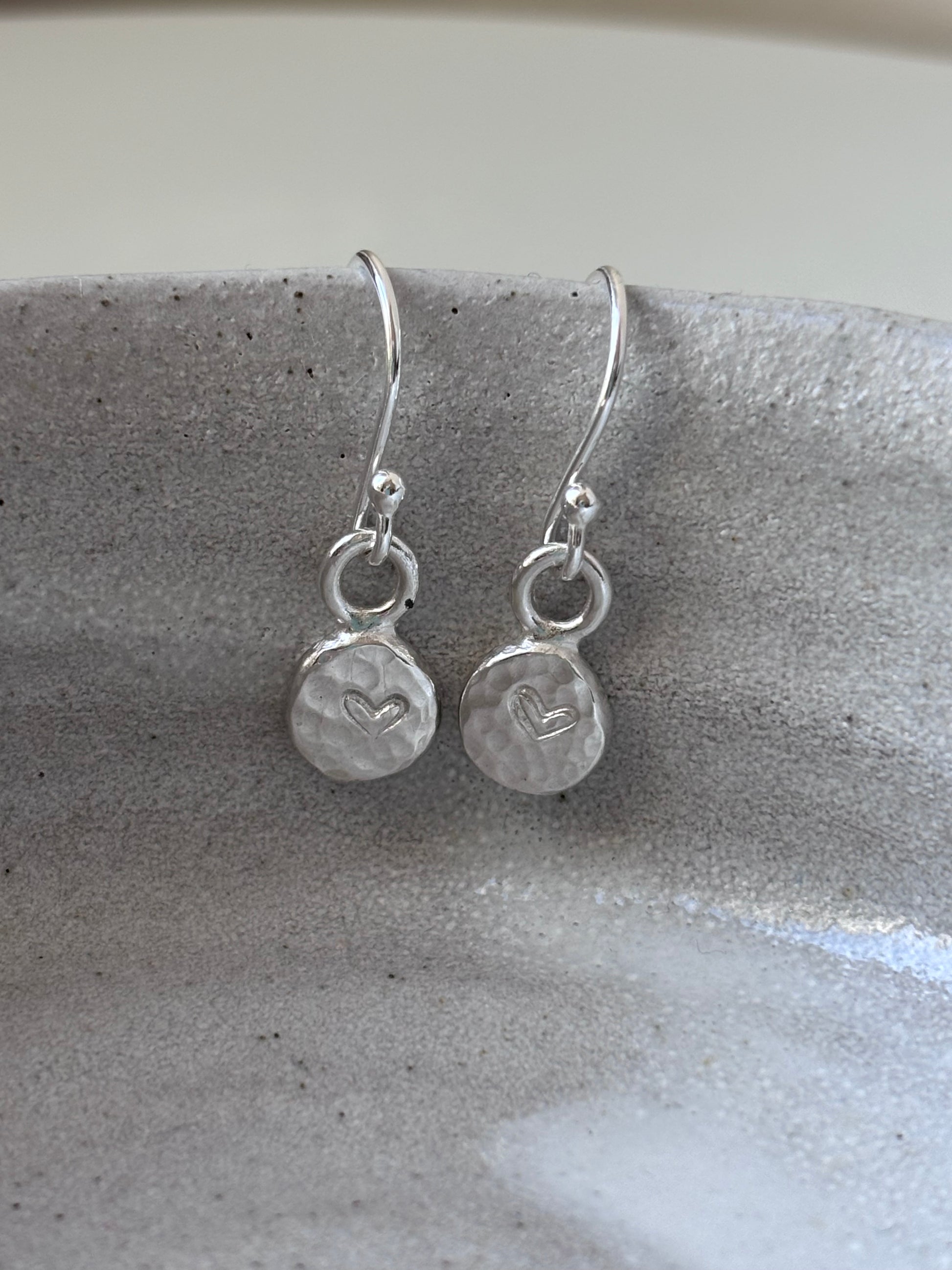 A set of sterling silver hammered pebble drops with a heart stamp motive.
